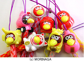 キョロちゃんが「招き猫」や「だるま」など、おめでたい姿に扮したストラップやフィギュアで、当時はお菓子のおまけやポイント交換品として絶大な人気を誇りました。